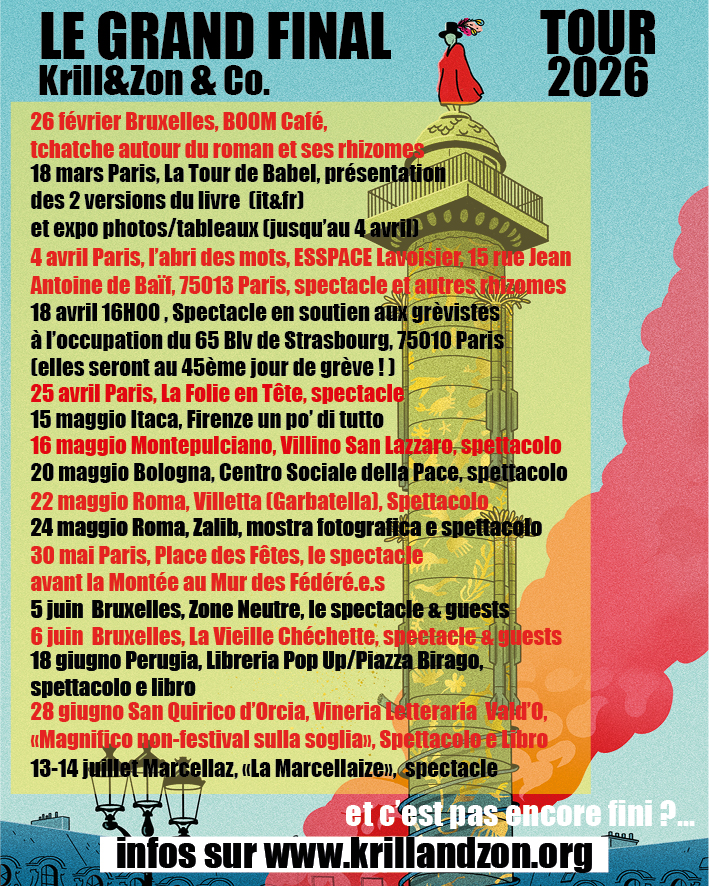 Bruxelles, 26 février 2026 à 19h00 : Tchatche autour du roman « Le Grand Final » et ses rhizomes à la bibliothèque anarchiste Boum, Boom Café, rue Pletinckx 7, 1000 Bruxelles.